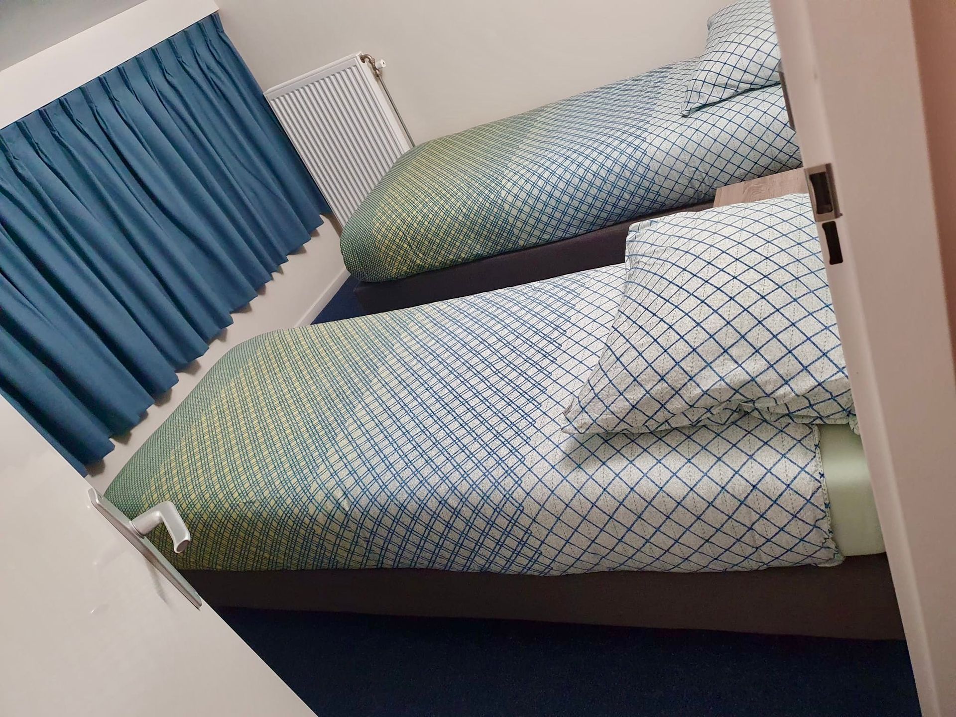 Tweepersoons slaapkamer op verdieping opgemaakt met 2x eenpersoons bed.